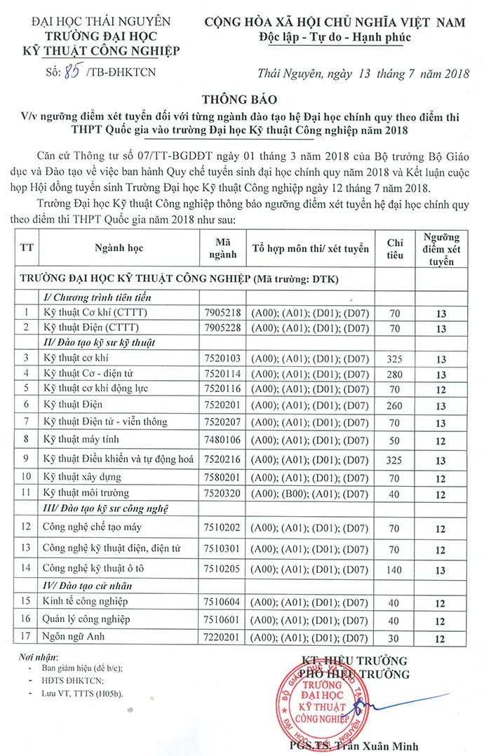 Ngày 13/7/2018, Trường ĐH Kỹ thuật công nghiệp (ĐH Thái Nguyên) đã ban hành văn bản số 85/TB-ĐHKTCN, thông báo ngưỡng điểm xét tuyển đối với từng ngành đào tạo hệ ĐH chính quy theo điểm thi THPT quốc gia năm 2018.