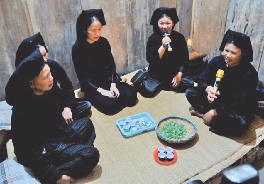 | Người nhà cô dâu và chú rể cùng tham gia hỏi thăm nhau, đối đáp những điệu dân ca |