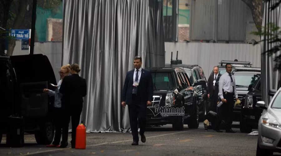 Ngay từ rất sớm, các tuyến đường Tràng Tiền, Lý Thái Tổ, Lê Phụng Hiểu... đều được lực lượng an ninh phong tỏa không cho người dân tiếp cận khu vực khách sạn (đoạn ngã tư Lý Thái Tổ, Lê Phụng Hiểu) .