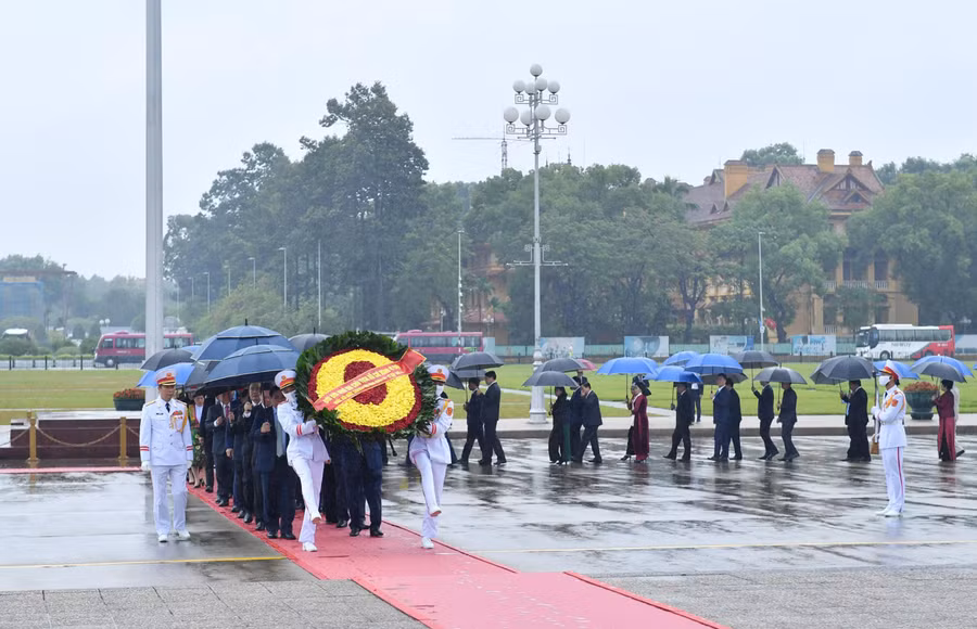 Trong tiếng quân nhạc trang nghiêm, lãnh đạo Đảng, Nhà nước, Quốc hội kính cẩn nghiêng mình với lòng biết ơn vô hạn, thành kính tưởng nhớ công lao to lớn của Chủ tịch Hồ Chí Minh đối với sự nghiệp đấu tranh giải phóng dân tộc, thống nhất đất nước, xây dựng Tổ quốc.