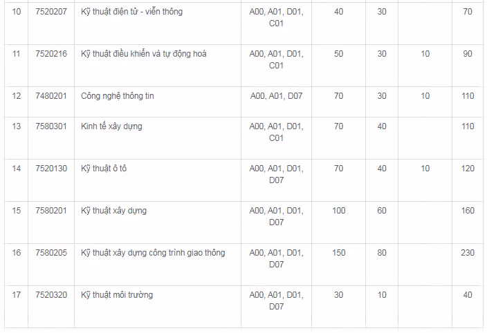 Trong khi đó, năm 2021, Phân hiệu Đại học Giao thông vận tải tại TP.HCM tuyển sinh 1.500 chỉ tiêu cho 17 ngành. Trong đó, ngành Kỹ thuật xây dựng công trình giao thông có chỉ tiêu nhiều nhất với tổng 230 chỉ tiêu.