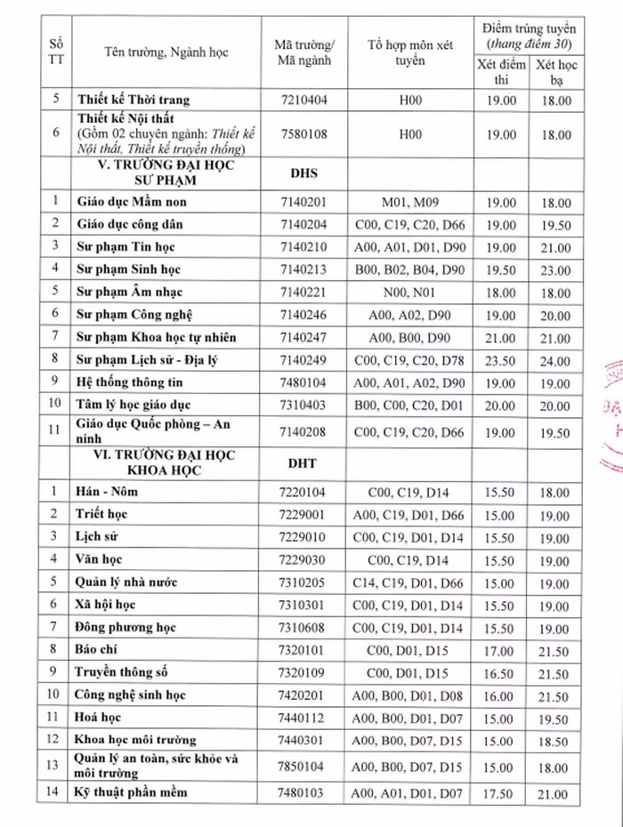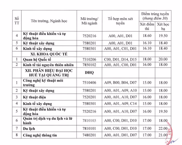 Theo đó, điểm trúng tuyển vào các trường thành viên của Đại học Huế bằng phương thức xét điểm thi tốt nghiệp THPT năm 2022 và phương thức xét kết quả học tập cấp THPT như sau: