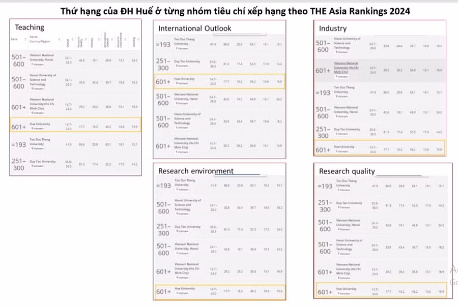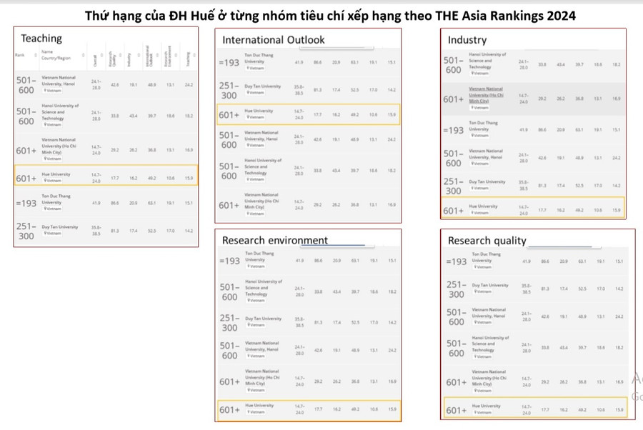 Thứ hạng của Đại học Huế ở từng nhóm tiêu chí xếp hạng và ở từng lĩnh vực khoa học theo THE Asia Rankings 2024 vẫn giữ vững thứ hạng và tăng lên. Điều này cho thấy chất lượng của Đại học Huế qua 1 năm đã được cải tiến theo chiều hướng đi lên.