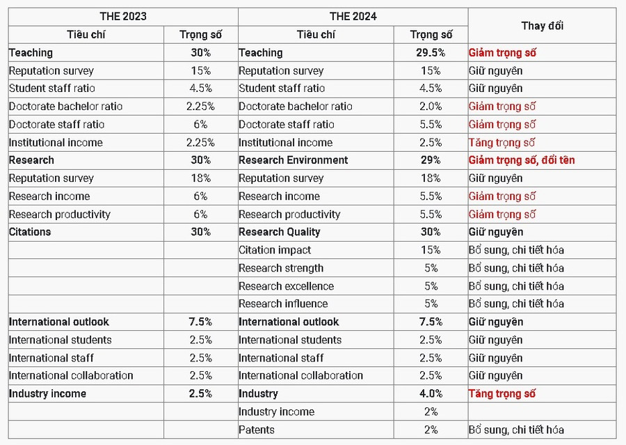 Bảng xếp hạng THE 2024 gồm 1.904 CSGDĐH đến từ 108 quốc gia, vùng lãnh thổ. Năm nay, THE sử dụng phương pháp xếp hạng WUR 3.0, trong đó trọng số một số tiêu chí được điều chỉnh so với THE 2023. Cụ thể như trong bảng sau đây: