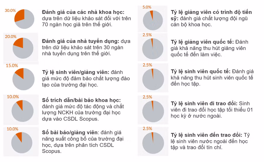Bảng xếp hạng QS châu Á có 10 tiêu chí với các trọng số khác nhau, bao gồm:
