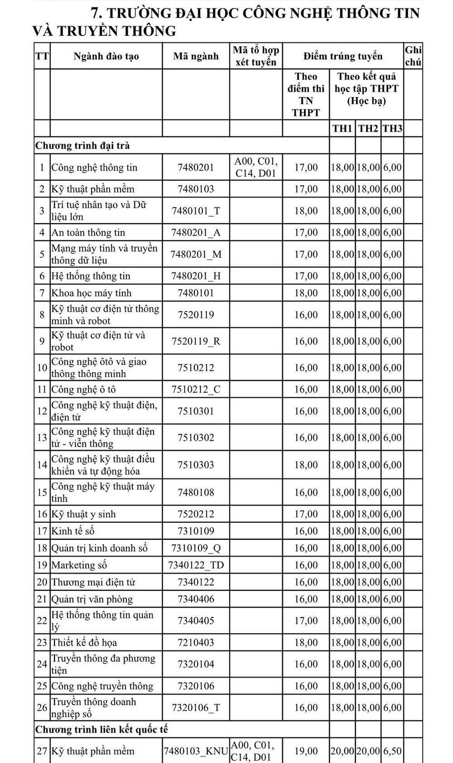Trường Đại học Công nghệ thông tin và truyền thông công bố điểm chuẩn bằng phương thức xét tuyển kết quả điểm thi THPT với mức 16 - 19 điểm theo từng ngành.