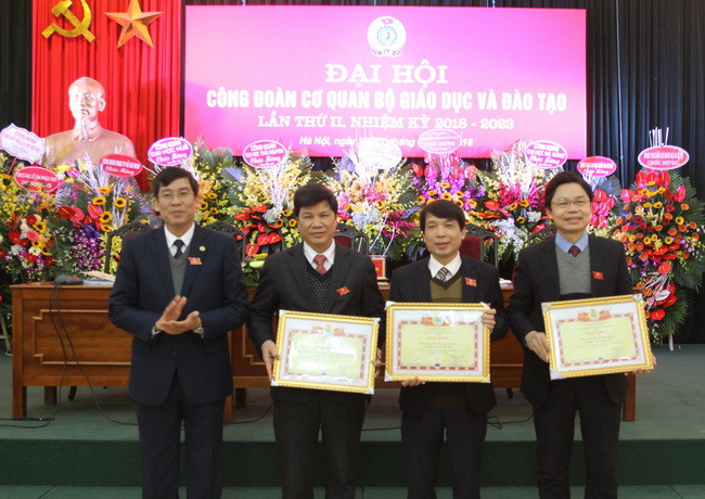 Ông Vũ Minh Đức- Chủ tịch Công đoàn Giáo dục Việt Nam tặng bằng khen cho các tập thể xuất sắc trong hoạt động công đoàn