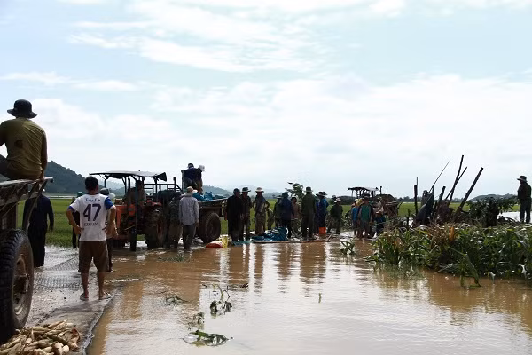 Ngay sau đó, đơn vị đã huy động lực lượng dân quân, xã đội phối hợp cùng người dân khống chế. Tuy nhiên đến tối nước tiếp tục chảy siết, nhấn chìm nhiều ha lúa của người dân. Sau đó, hàng trăm người dân cùng lực lượng chức năng tiếp tục đắp bờ đê và gia cố lại. Đến sáng nay đoạn cống đầu nguồn của cánh đồng A và đoạn đê vỡ của cánh đồng B đã được gia cố tương đối.