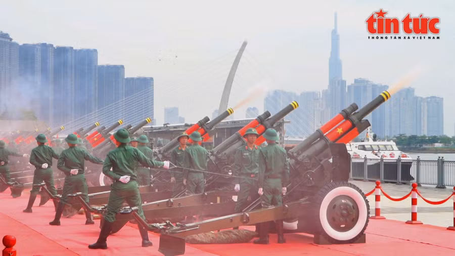 Đúng 7h sáng 30/4, mở màn đại Lễ kỷ niệm 50 năm Ngày giải phóng miền Nam, thống nhất đất nước, 21 loạt đại bác đã khai hỏa vang rền cả một vùng trời tại khu vực công viên Bến Bạch Đằng, Quận 1, TPHCM.