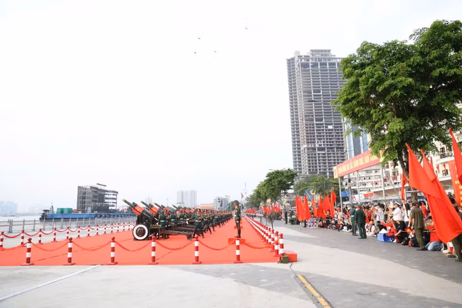 Trận địa pháo gồm 15 khẩu pháo lớn, mỗi khẩu nặng khoảng 4 tấn, được đặt trên nền thảm đỏ kéo dài 90m dọc tuyến đường Tôn Đức Thắng, tạo nên khung cảnh uy nghi, thiêng liêng.