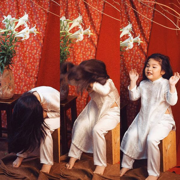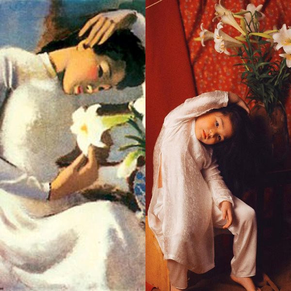 Trong bộ trang phục áo dài truyền thống, Mầm không ngần ngại tạo dáng theo tác phẩm nổi tiếng "Thiếu nữ bên hoa huệ" nhưng với đủ các cung bậc cảm xúc khác nhau, từ sợ sệt, trầm tư đến phấn khích, e lệ khiến bất cứ ai xem cũng đều phì cười.