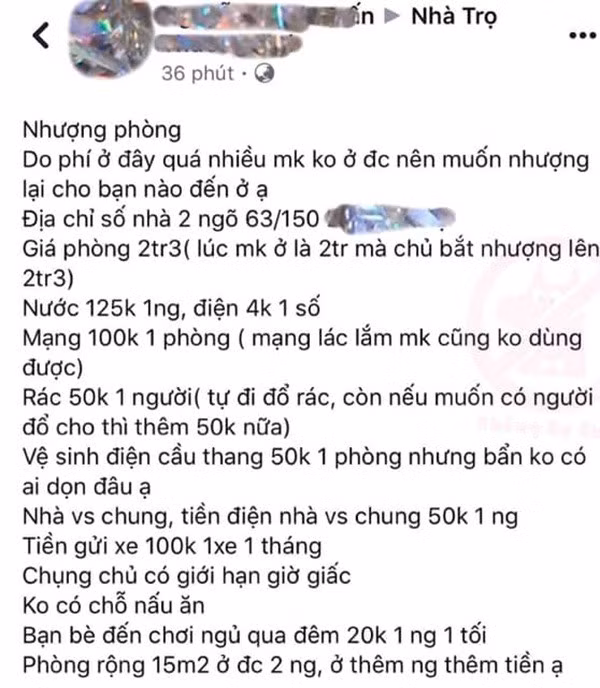 Mới đây, do không kham nổi những khoản chi phí tại khu trọ đang ở, nên một bạn sinh viên đã đăng tải thông tin nhượng nhà trọ. Thế nhưng thay vì vẽ ra những điều hoa mĩ, thì dường như bà chủ trọ lại khiến cô gái không ưa. Do vậy, bao nhiêu cái xấu, cùng danh sách các khoản thu nhằm "moi tiền" của người thuê trọ đều bị lôi ra kể hết.