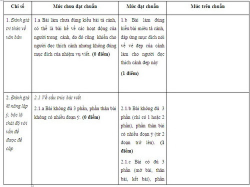 Dưới đây là ví dụ về thiết kế chỉ số đánh giá bài viết của HS theo đề số 1 (miêu tả cảnh đẹp) :
