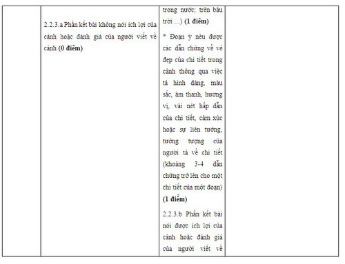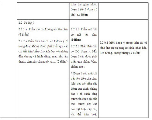 Ví dụ: Nếu là bài văn viết theo đề số 1 thì bài viết cần thể hiện dàn ý rõ ràng gồm 3 phần (mở bài, thân bài, kết bài); phần thân bài cần gồm nhiều đoạn ý; mỗi đoạn ý thể hiện một chi tiết về cảnh đẹp, trong đoạn gồm có những thông tin cốt lõi, tiêu biểu về cảnh được kết nối bằng sự mô tả, phân tích, suy luận hoặc bộc lộ cảm xúc của cá nhân.
