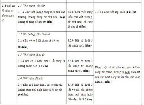 - Tiêu chí 3 để đánh giá kĩ năng sử dụng ngôn từ : bao gồm, kĩ năng viết chữ và trình bày bài, kĩ năng chính tả; kĩ năng sử dụng từ, đặt câu phù hợp với kiểu văn bản.