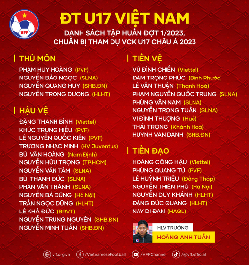 Nằm trong kế hoạch chuẩn bị tham dự Vòng chung kết U17 châu Á 2023, đội tuyển U17 Việt Nam dưới sự dẫn dắt của HLV trưởng Hoàng Anh Tuấn sẽ tập trung đợt đầu tiên trong năm 2023 với 34 cầu thủ.