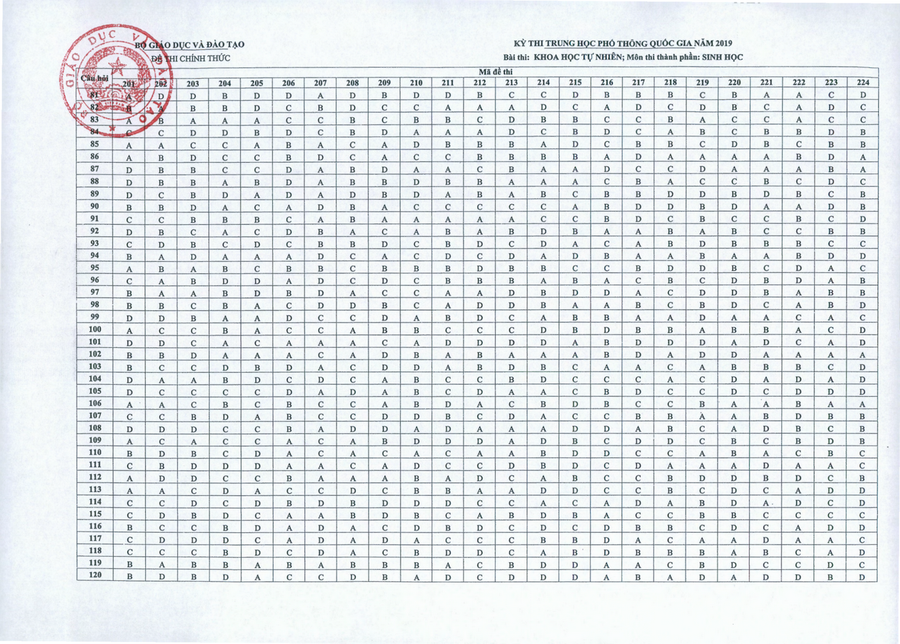 Xem chi tiết Đáp án chính thức môn Sinh học thi THPT quốc gia 2019 của Bộ GD&ĐT đủ 24 mã đề TẠI ĐÂY