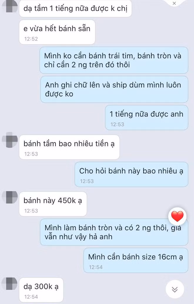Trong tin nhắn đặt bánh của chị V.P, chị cho biết mình không cần bánh trái tim như minh họa mà có thể thay bằng hình tròn và chỉ cần 2 mặt người thôi là được. Tuy nhiên đến khi nàng dâu nhìn thấy chiếc bánh bố chồng nhận được thì không thốt nên lời.