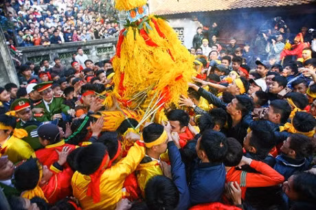 Hình ảnh hàng nghìn người tranh giành hoa tre, trầu cau tại hội Gióng, đền Sóc (Sóc Sơn, Hà Nội).