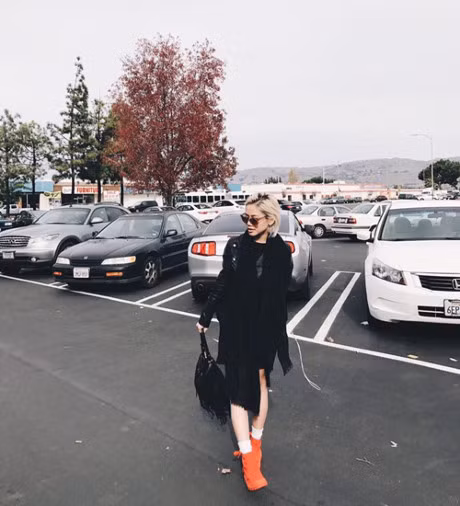 Có thể nói đây là style all-black cách điệu bởi Yến Lê sử dụng đôi giày converse cao cổ màu cam cà rốt tạo điểm nhấn thú vị cho set đồ. Nó giúp các nàng F5 lại cảm xúc cho những ngày cuối tuần cần nhiều năng lượng.
