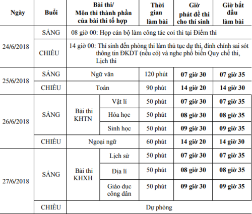 Kỳ thi THPT quốc gia năm 2018 sẽ diễn ra từ 24/6/2018 đến 27/6/2018. Cụ thể, ngày 24/6 thí sinh làm thủ tục dự thi và bắt đầu làm bài thi từ 25/6.
