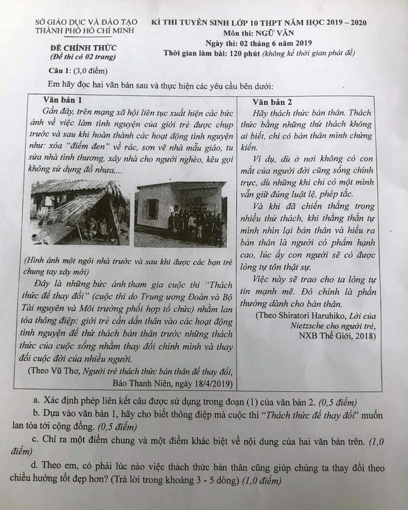 Nội dung Đề thi môn Ngữ văn vào lớp 10 năm học 2019 – 2020 của TP Hồ Chí Minh:
