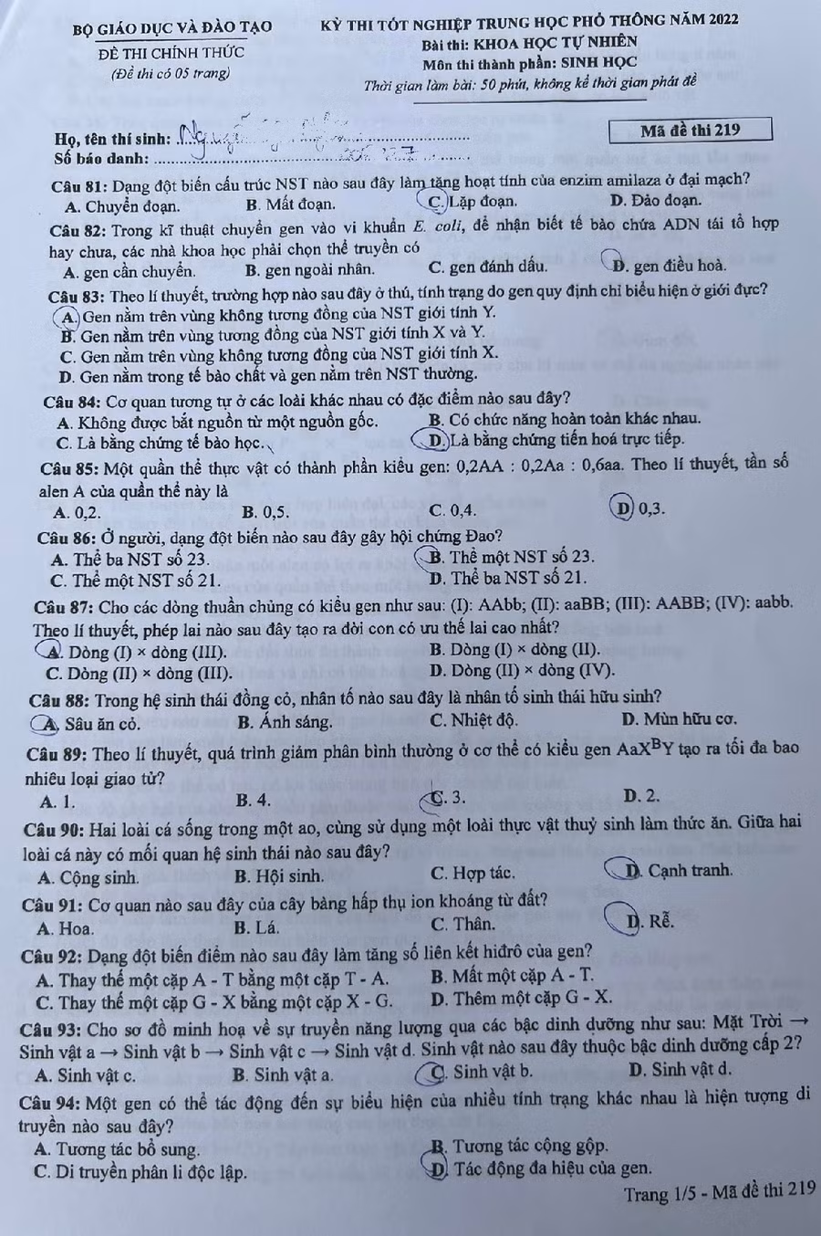 Bài thi môn Sinh học diễn ra trong 50 phút theo hình thức trắc nghiệm. Đề thi gồm có 40 câu hỏi.