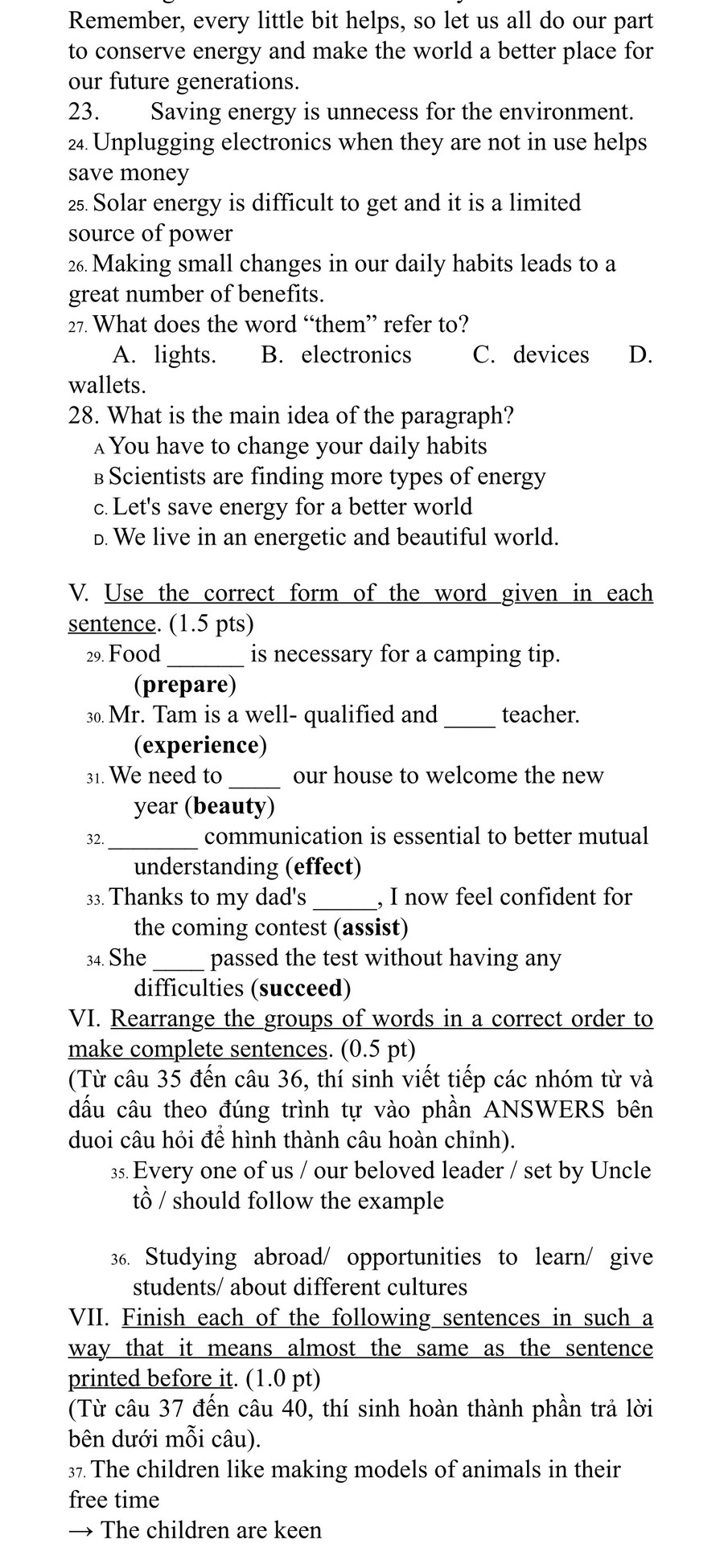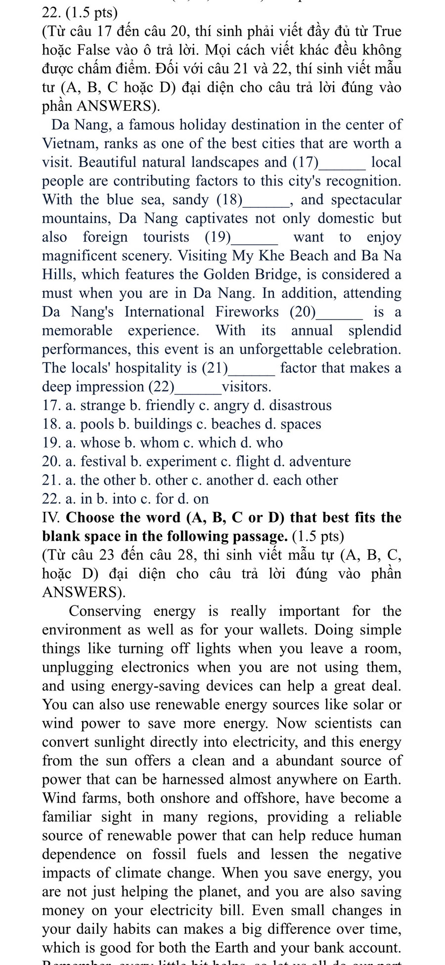 Nội dung bài Cloze test hay, quảng bá vẻ đẹp Đà Nẵng. Các câu hỏi phần này có nội dung không quá khó. Phần điền dạng đúng của từ (word form) và viết lại câu (sentence transformation) cũng không quá khó.