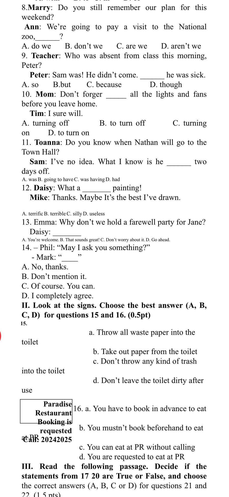 2 chủ điểm đoạn văn, kiến thức từ vựng cũng dễ hơn năm ngoái. Trong khi đó, chủ đề đúng trọng điểm của năm học. 4 câu ngữ pháp cũng không làm khó thí sinh", thầy Thảo nhấn mạnh.