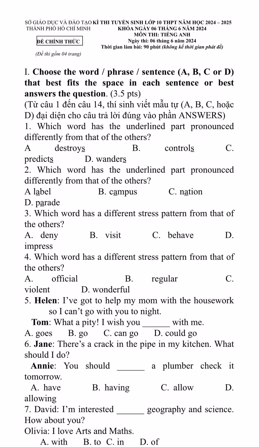 Đề thi môn tiếng Anh kỳ thi tuyển sinh vào lớp 10 tại TPHCM:
