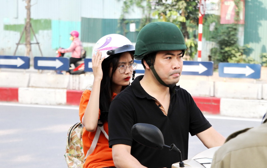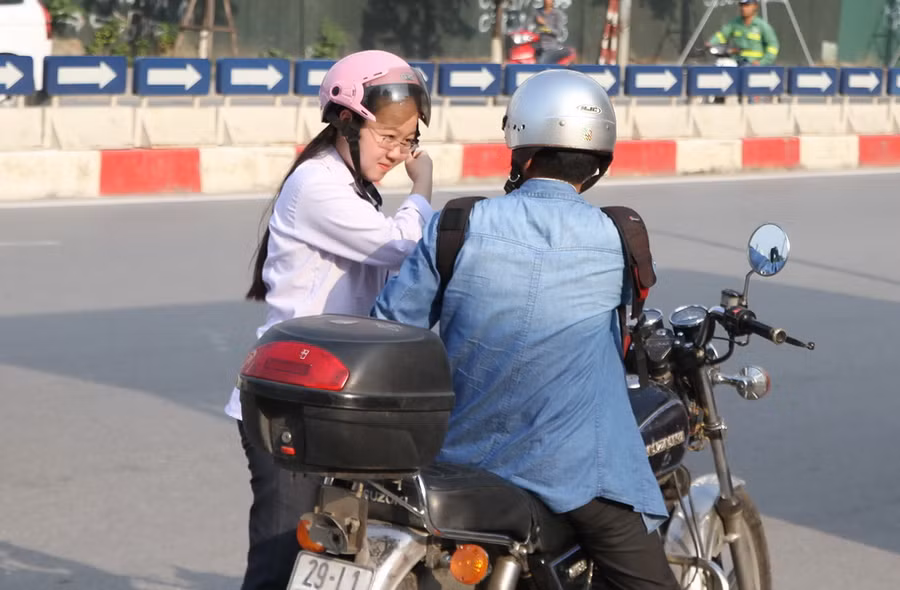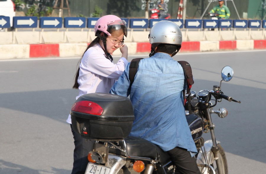 Trước khi tháo mũ bảo hiểm, em học sinh này được bố dặn dò rất nhiều điều để yên tâm bước vào phòng thi
