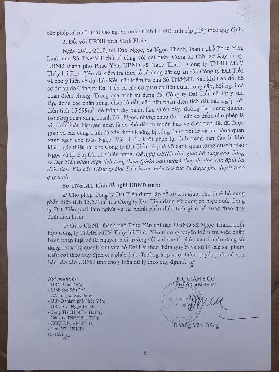 Tại kết luận kiểm tra (KL số 10/KL-STNMT) mới được ông Hoàng Văn Đăng - Phó Giám đốc Sở TN&MT tỉnh Vĩnh Phúc ký đã khẳng định: “Công ty Đạt Tiến đã tự ý san lấp, đóng cọc, đắp nền phần diện tích bán ngập với diện tích 15.599 m2 để trồng cây, làm vườn, đường dạo xung quanh… khi chưa được cấp có thẩm quyền cho phép là vi phạm pháp luật”.