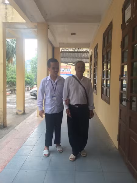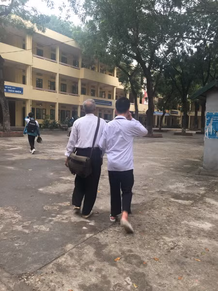Trần Quang Hiếu, học sinh lớp 12A12 trường THPT Ngô Quyền (Ba Vì, Hà Nội) bị mắc căn bệnh não úng thủy từ lúc mới sinh nên việc đi học và sinh hoạt hàng ngày của em cần phải có người chăm sóc. Bố mẹ bận đi làm nên ông nội là người đồng hành với em suốt những ngày đến trường.