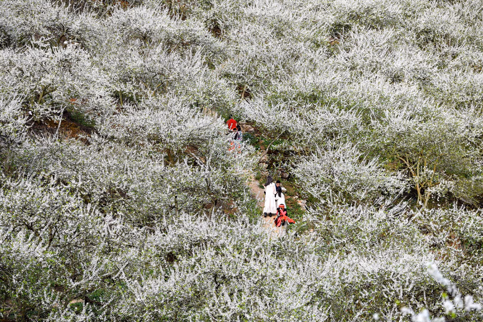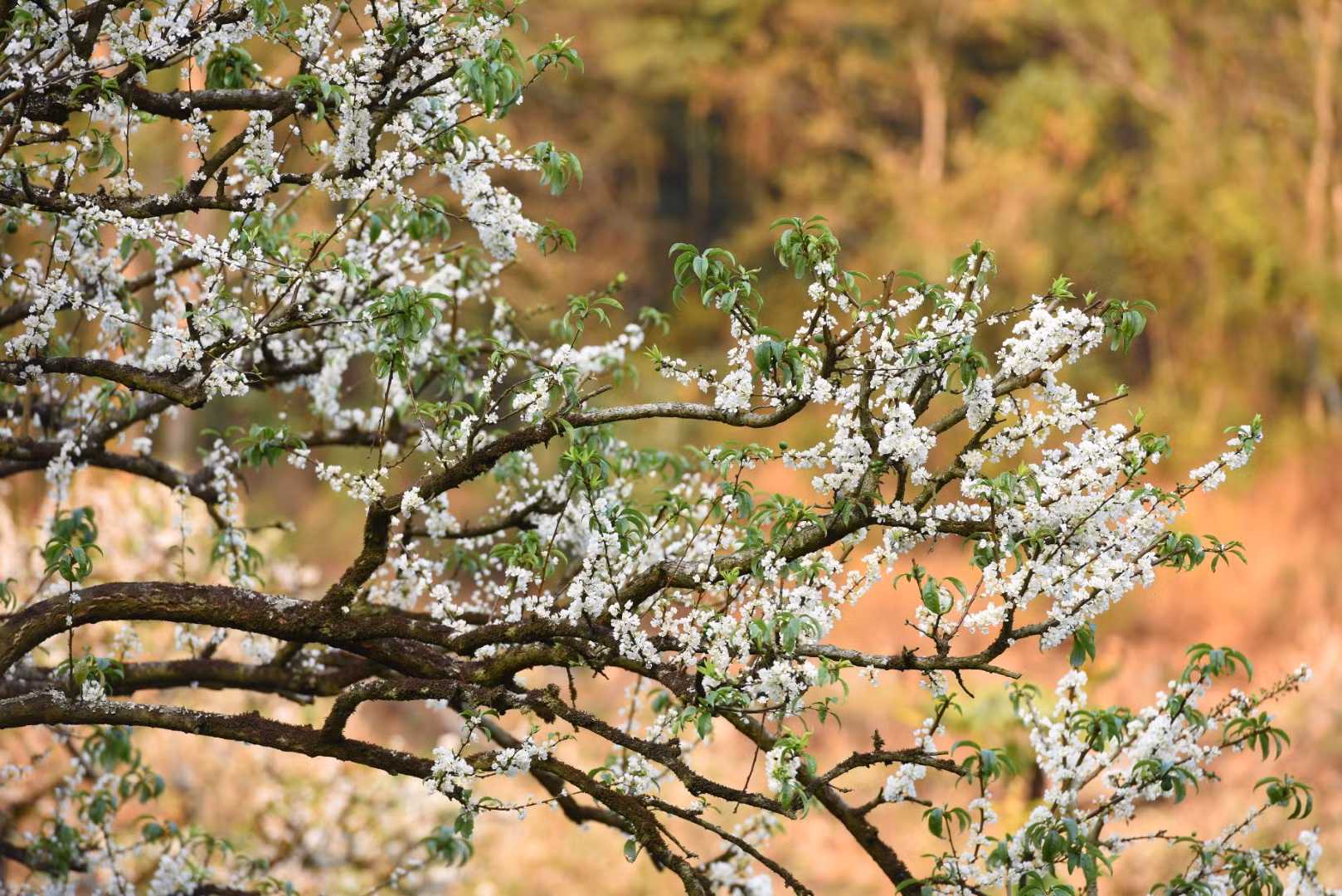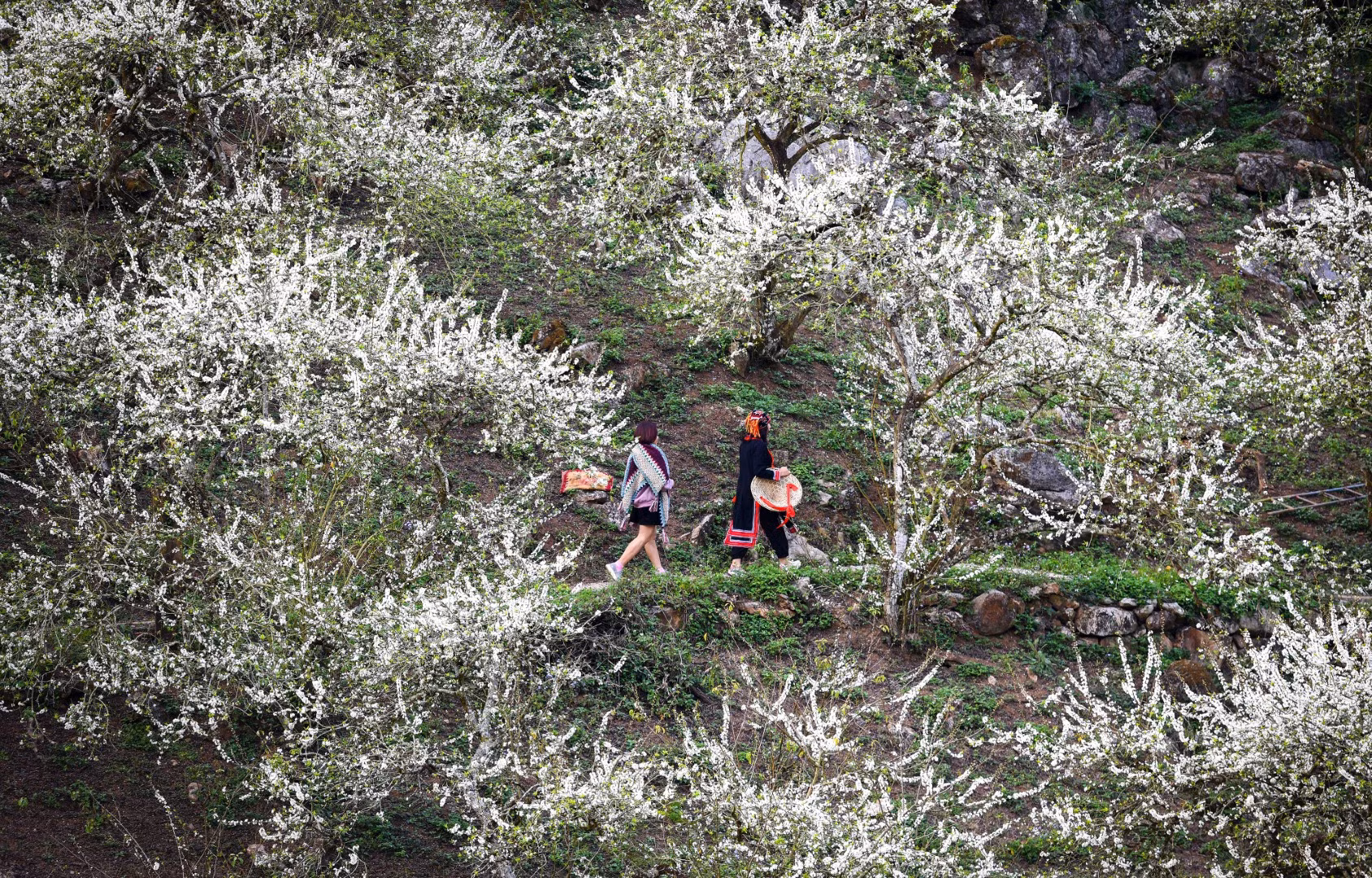 Hoa mận nở thành từng chùm, màu trắng xoá như những bông tuyết xinh xắn bao phủ khắp cả thung lũng, sườn đồi khiến lữ khách như lạc bước vào chốn thần tiên.
