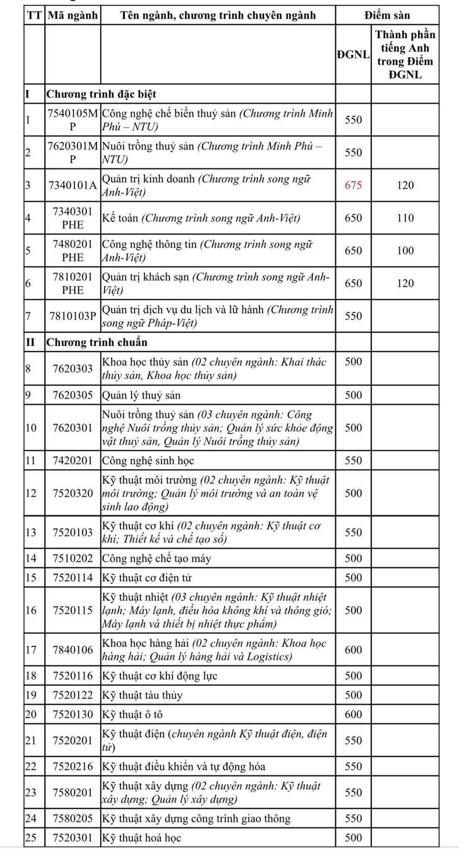 Theo đó, điểm sàn xét tuyển theo điểm thi Đánh giá năng lực của ĐHQG TPHCM cho chương trình đặc biệt vào Trường ĐH Nha Trang từ 550 - 576 điểm.