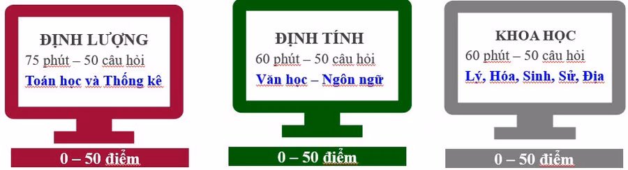 Theo đó, cấu trúc bài thi được điều chỉnh phù hợp với việc dạy và học theo chương trình giáo dục phổ thông, có thêm bài thi Ngoại ngữ. Cụ thể, cấu trúc gồm 3 phần: Phần 1 gồm Toán học và xử lý số liệu (50 câu hỏi, 75 phút); Phần 2 gồm Ngôn ngữ - Văn học (50 câu hỏi, 60 phút); Phần 3 gồm Khoa học (50 câu hỏi, 60 phút).