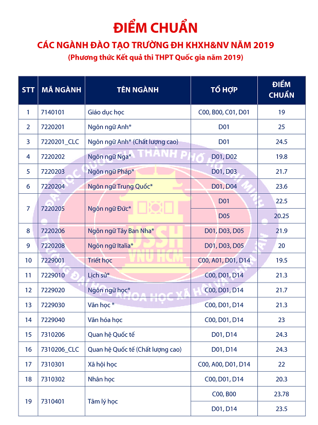 Cụ thể; ngày 14/8, các ngành Xã hội học, Văn hóa học, Ngôn ngữ Nga, Quan hệ Quốc tế Ngôn ngữ Đức, Ngôn ngữ Pháp, Ngôn ngữ Trung Quốc, Ngôn ngữ Tây Ban Nha, Lịch sử, Văn học, Ngôn ngữ học, Ngôn ngữ Italia, Triết học, Giáo dục học, Ngôn ngữ Anh