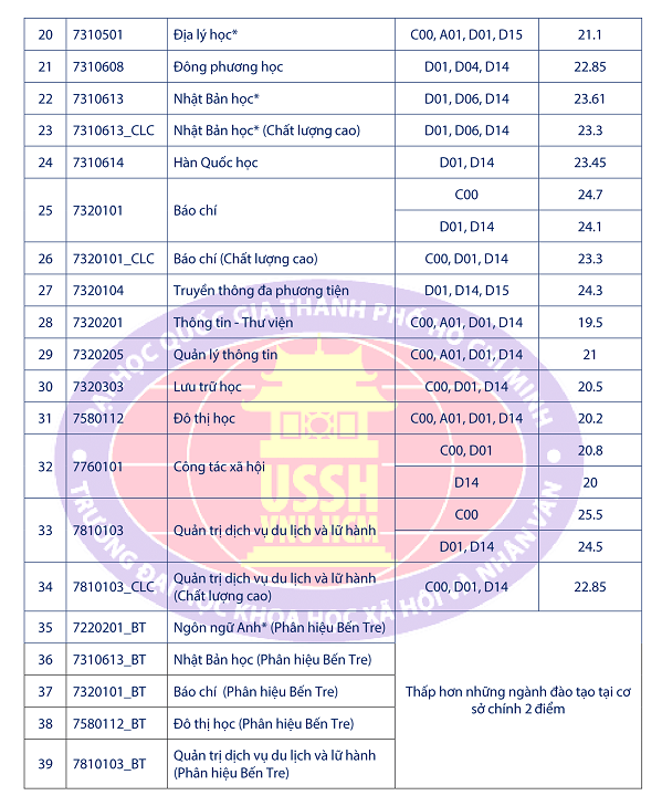 Ngày 15/8: các ngành Đô thị học, Lưu trữ học, Công tác xã hội, Quản lý thông tin, Địa lý học, Nhật Bản học, Hàn Quốc học Báo chí, Truyền thông đa phương tiện, Thông tin – Thư viện, Quản trị dịch vụ du lịch và lữ hành, Nhân học, Tâm lý học, Đông phương học.