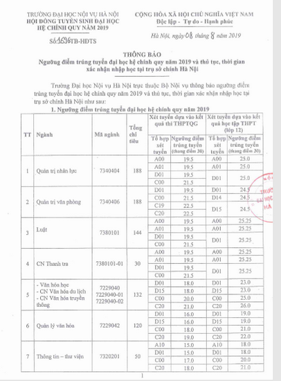 | Ngưỡng điểm trúng tuyển hệ ĐH chính quy năm 2019 của Trường ĐH Nội Vụ Hà Nội cơ sở chính Hà Nội. |