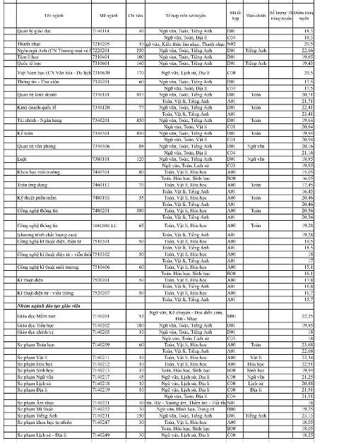 Ngành học có điểm trúng tuyển cao nhất là ngành Ngôn ngữ anh. Ngành có điểm chuẩn trúng tuyển thấp nhất là ngành Công nghệ kỹ thuật môi trường.