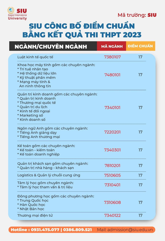 Theo đó, điểm trúng tuyển đối với phương thức xét tuyển bằng kết quả thi tốt nghiệp THPT vào SIU là 17 điểm dành cho tất cả các ngành.