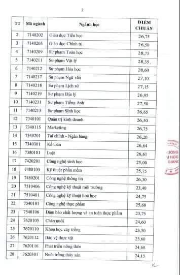 Giáo dục Chính trị và ngành Quản trị kinh doanh 26,50 điểm; Công nghệ thông tin 26,30 điểm; Kinh tế quốc tế 26,25 điểm; ngành Tài chính - Ngân hàng 26,20 điểm; Việt Nam học 26,10 điểm; Ngôn ngữ Anh 25,87 điểm; ngành Thú y 25,80 điểm; Kỹ thuật phần mềm 25,75 điểm; Công nghệ thực phẩm và ngành Bảo vệ thực vật 25,60 điểm; Công nghệ Sinh học 25,00 điểm;