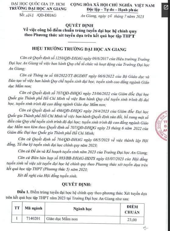 | Đại học An Giang công bố điểm chuẩn trúng tuyển năm 2023. |