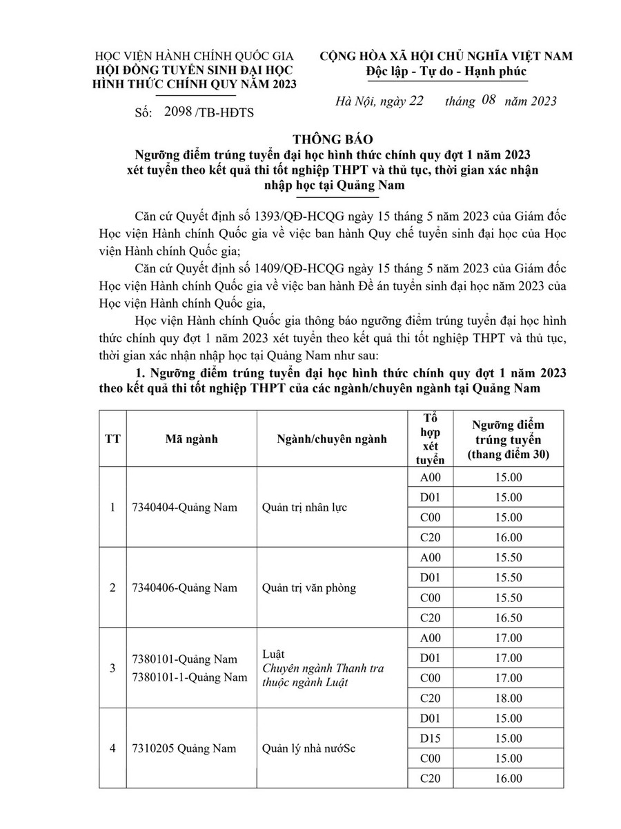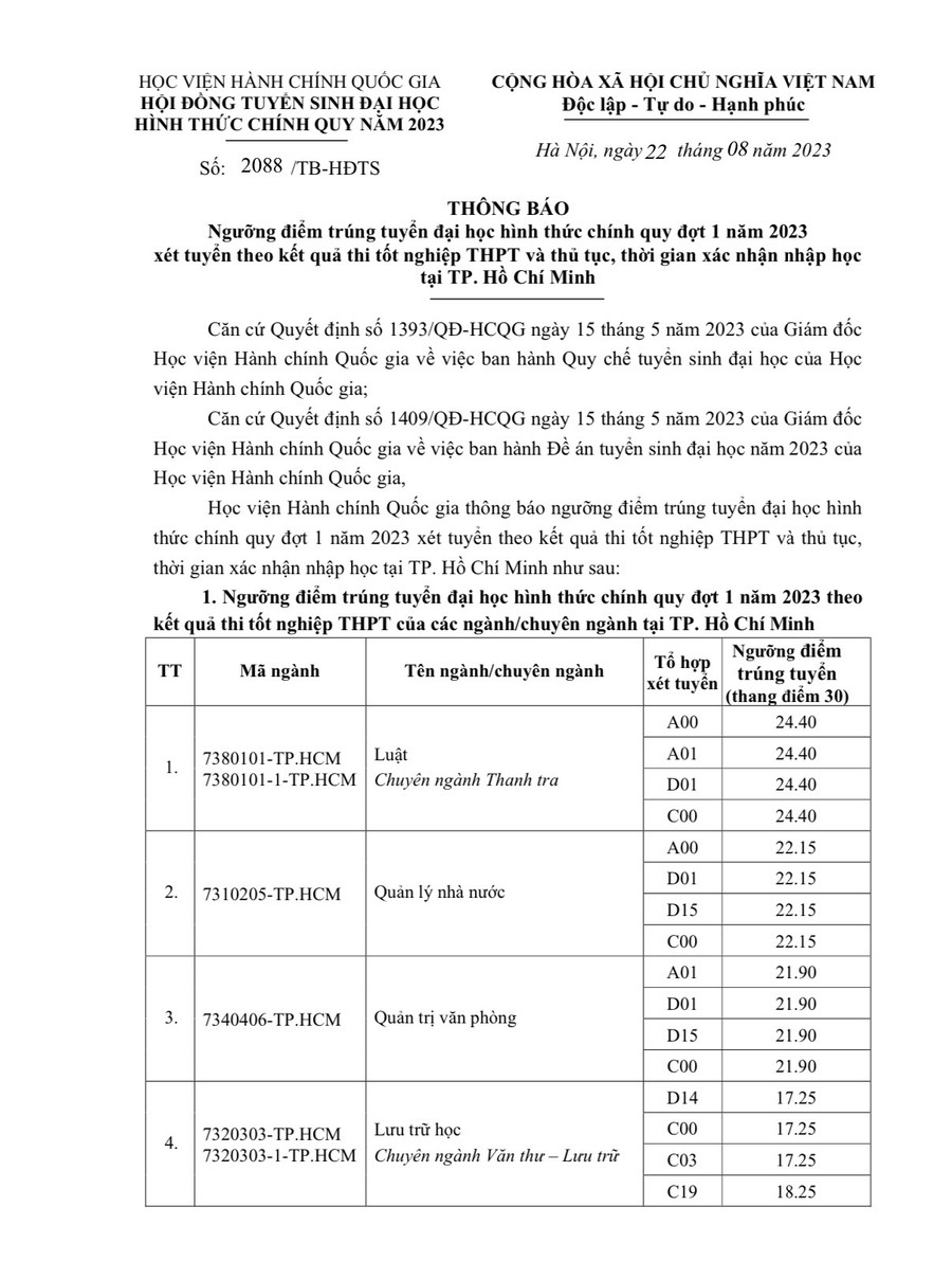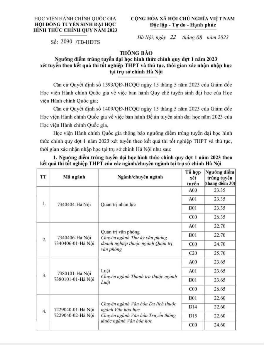 Chiều 22/8, Học viện Hành chính Quốc gia thông báo điểm trúng tuyển đại học hình thức chính quy đợt 1 năm 2023 xét tuyển theo kết quả thi tốt nghiệp THPT và thủ tục, thời gian xác nhận nhập học tại trụ sở chính Hà Nội.