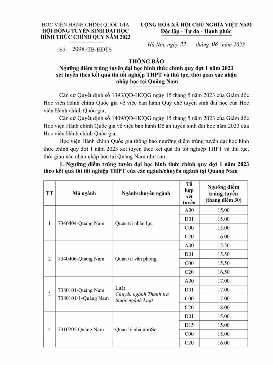Chi tiết điểm trúng tuyển vào Học viện Hành chính Quốc gia năm 2023: