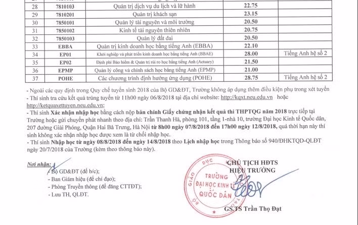 Nhà trường lưu ý: Thí sinh xác nhận nhập học bằng cách nộp bản chính Giấy chứng nhận kết quả thi THPT quốc gia 2018 trực tiếp tại trường hoặc gửi chuyển phát nhanh theo địa chỉ: Trần Thanh Hà, phòng 101, tầng 1-nhà 10, Trường ĐH Kinh tế Quốc dân, 207 đường Giải Phóng, quận Hai Bà Trưng, Hà Nội)..