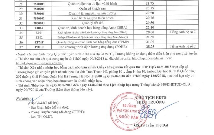 Nhà trường lưu ý: Thí sinh xác nhận nhập học bằng cách nộp bản chính Giấy chứng nhận kết quả thi THPT quốc gia 2018 trực tiếp tại trường hoặc gửi chuyển phát nhanh theo địa chỉ: Trần Thanh Hà, phòng 101, tầng 1-nhà 10, Trường ĐH Kinh tế Quốc dân, 207 đường Giải Phóng, quận Hai Bà Trưng, Hà Nội)..