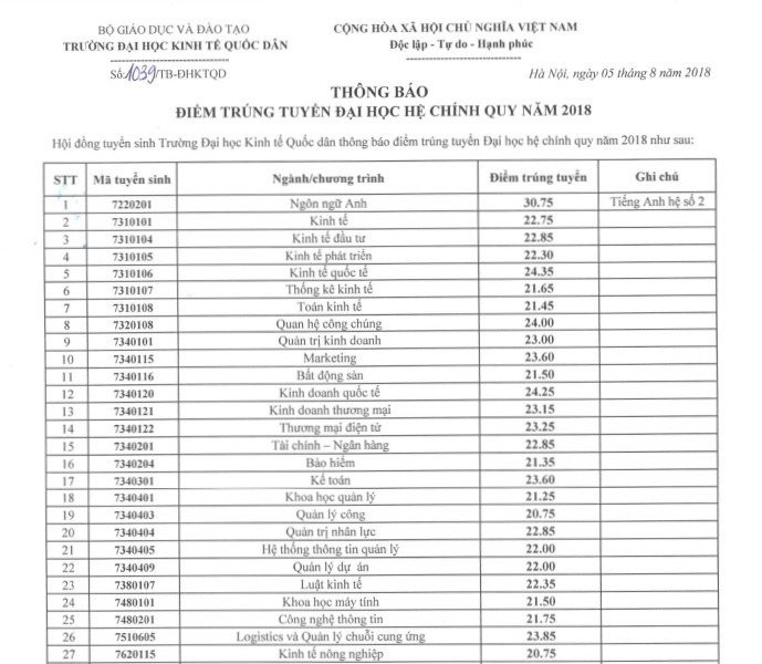Điểm chuẩn trúng tuyển của tất cả các ngành của Trường ĐH Kinh tế quốc dân năm 2018: