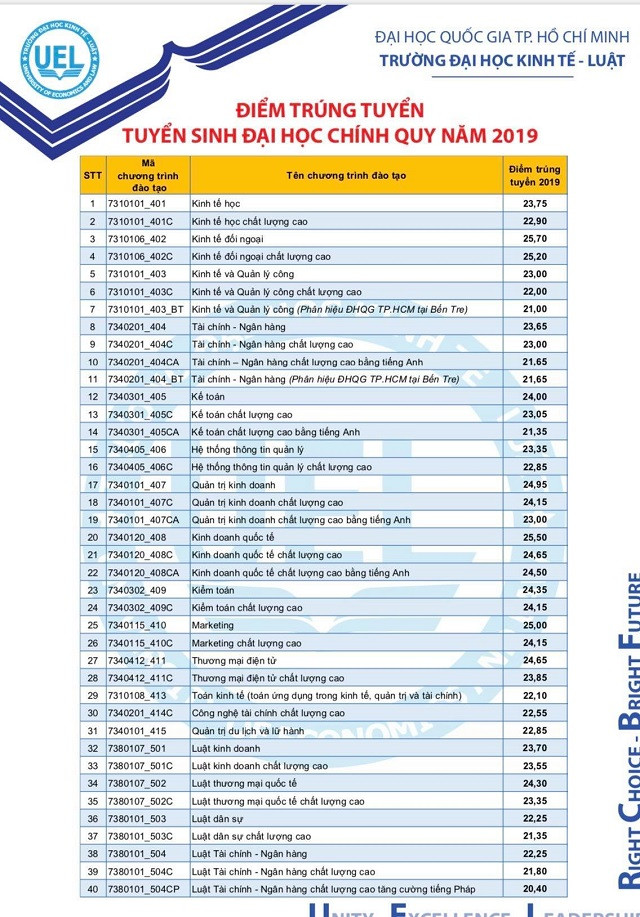 Theo thống kê, có 12.197 thí sinh với 21.690 nguyện vọng đăng ký vào UEL theo phương thức xét tuyển dựa trên kết quả thi THPT Quốc gia. Trong đó, 895 thí sinh có tổng điểm >= 24 trúng tuyển vào UEL. Thủ khoa là thí sinh Lê Thị Ngọc Ánh (Trường THPT Mộ Đức 2, tỉnh Quảng Ngãi) với điểm thi 27,95 điểm, trúng tuyển vào ngành Kinh tế quốc tế (chưa tính điểm ưu tiên). TP.HCM, Đồng Nai, Bình Định là ba tỉnh thành có số thí sinh trúng tuyển vào UEL nhiều nhất.