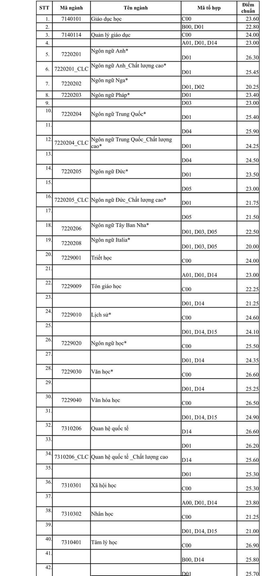 10 ngành có tổ hợp điểm chuẩn cao nhất gồm: Báo chí, Quản trị dịch vụ du lịch và lữ hành, Truyền thông đa phương tiện, Tâm lý học, Quản lý thông tin, Quản trị văn phòng, Quan hệ quốc tế, Ngôn ngữ Anh, Nhật Bản học, Việt Nam học.